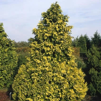 Chamaecyparis lawsoniana ‘Golden Wonder’ is een compact groeiende conifeer met geel loof.