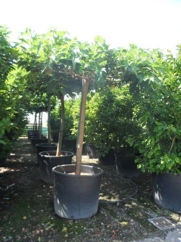 Later in het jaar ontstaan de eetbare vruchten, de vruchten zitten qua smaak tussen een braam en een framboos in. De dakmoerbei staat graag op een zonnige en beschutte plek. In het voorjaar kunt u de dakmoerbei snoeien. Wij leveren geen Morus uit de volle grond, omdat de aanslagkans dan zeer klein is! De Dakmoerbei is vanaf 18/20,C150 met een stamhoogte van 280cm verkrijgbaar!