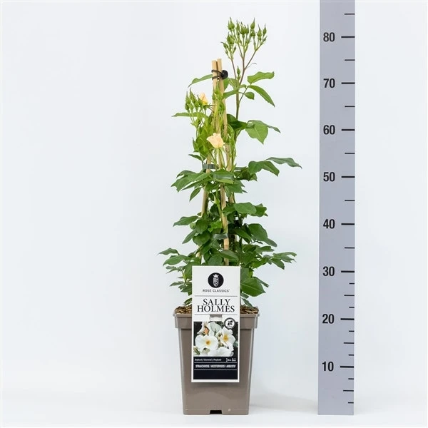 Rosa ‘Sally Holmes’ is een enkelbloemige roos met cremewitte bloemen met een zweem roze. Bloeit opvallend lang en rijk en geurt heerlijk.