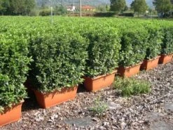 Viburnum ‘Eve Price’ groeit nog wat compacter dan Viburnum tinus. Ook is het blad wat kleiner. Dit maakte deze wintergroene plant erg geschikt voor vormsnoei. Hier toegepast als handige kant en klare haag, ideaal voor het snel realiseren van een mooie volle haag.