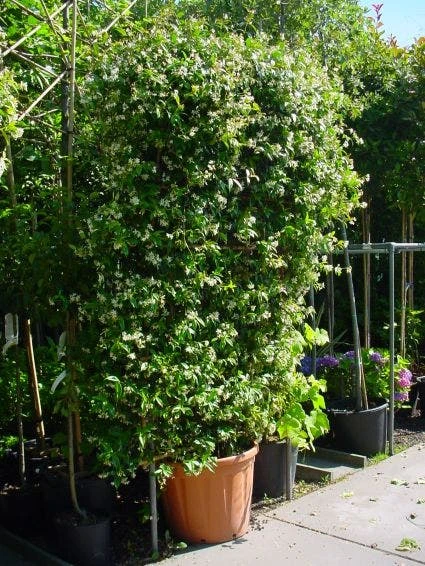 Trachelospernum jasminoides (Sterjasmijn) gekweekt als leivorm.