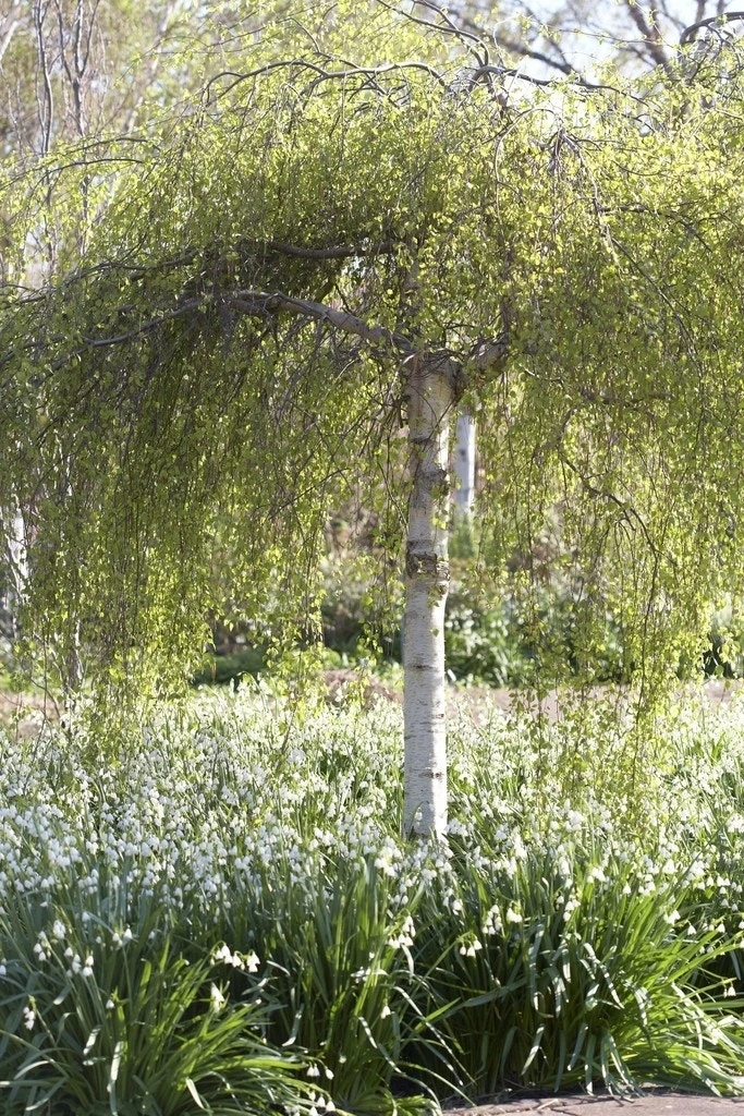 Betula pendula ‘Tristis’ is een Treurberk met doorgaande stam en hangende zijtakken.